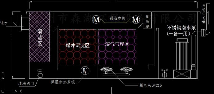 3. 污水流入油水分离腔,通过加热使油污变得更有流动性,通过刮油装置把油刮除到排油槽,废油从溢流堰自然流出由废油收集桶收集起来,定期清理废油即可,这样浮油得到去除。